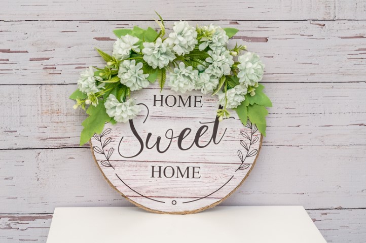 Ταμπέλα με μήνυμα sweet home, σε λευκό χρώμα με γαλάζια χρυσάνθεμα, για να διακοσμήσετε την εξώπορτα ή το τζάκι σας. Διάμετρος 24εκ.