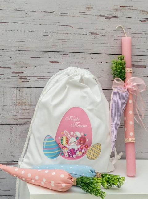 Σακίδιο πλάτης με ροζ πασχαλινή παράσταση. Περιλαμβάνει λαμπάδα και διακοσμητικά καρότα.