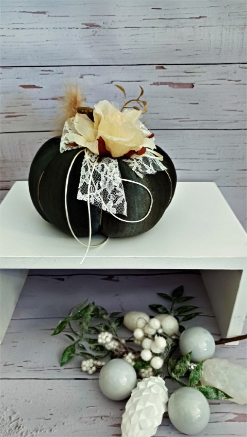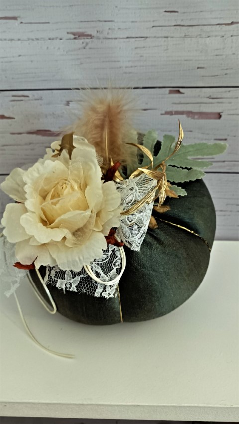 Μεγάλη κολοκύθα κατασκευασμένη από βελούδο ύφασμα σε χρώμα πράσινο κυπαρισσί. Διαστάσεις: Ύψος 15εκ. x 17εκ.
