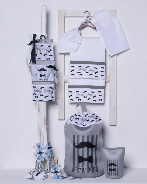 Σετ βάπτισης για αγόρι με θέμα μουστάκι, που αποτελείται από σάκο, λαμπάδα, λαδόπανα και λαδοσέτ, όλα συνδυασμένα αρμονικά μεταξύ τους και κατασκευασμένα με εξαιρετικής ποιότητας υλικά. Υπάρχει η δυνατότητα επιλογής μεμονωμένων κομματιών.