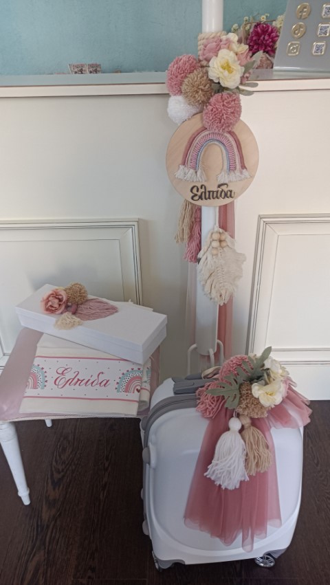 Σετ βάπτισης για κορίτσι με θέμα ουράνιο τόξο, που αποτελείται από βαλίτσα, λαμπάδα, λαδόπανα και λαδοσέτ, όλα συνδυασμένα αρμονικά μεταξύ τους και κατασκευασμένα με εξαιρετικής ποιότητας υλικά. Υπάρχει η δυνατότητα επιλογής μεμονωμένων κομματιών.