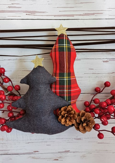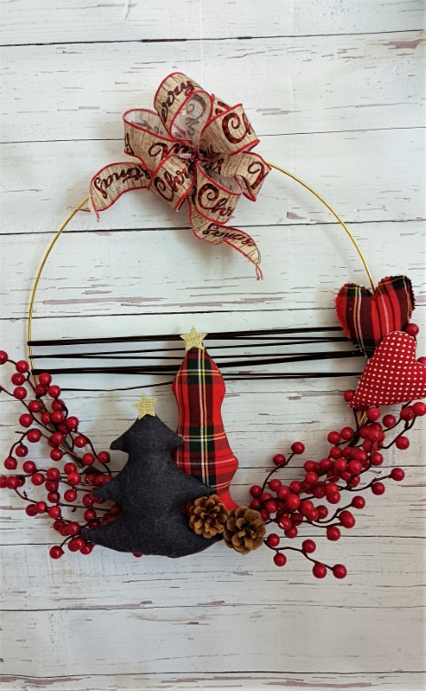 Πρωτότυπο Χριστουγεννιάτικο μεταλλικό στεφάνι, διακοσμημένο με δεντράκια κατασκευασμένα από ύφασμα, κλαδιά berries και εντυπωσιακό φιόγκο.
