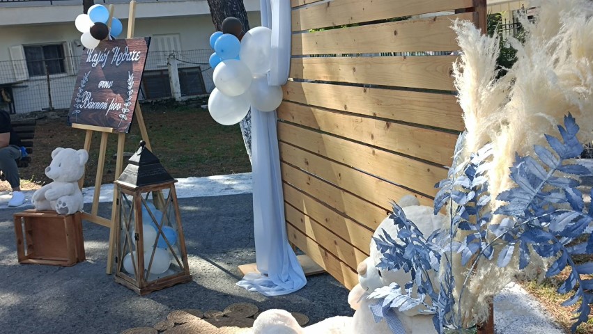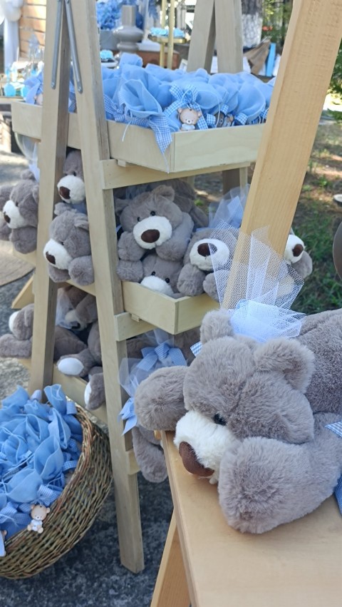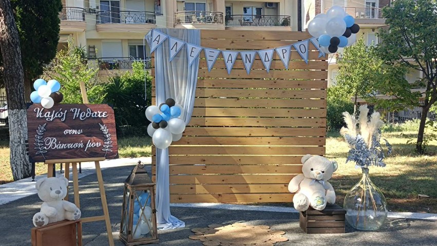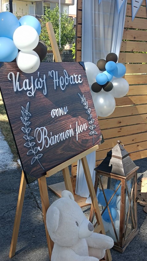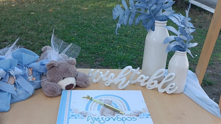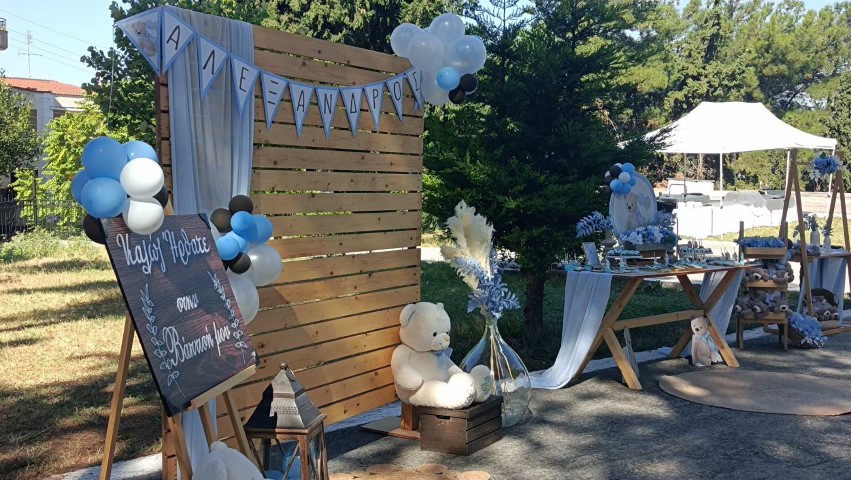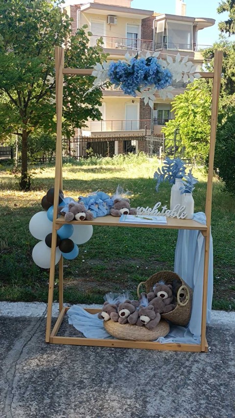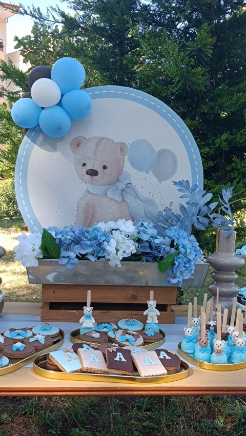 Ιδέες διακόσμησης με θέμα το αρκουδάκι που σίγουρα θα λατρέψετε. Ένα όμορφο σκηνικό σε αποχρώσεις του γαλάζιου με συνθέσεις μπαλονιών, ορτανσίες και pampas. Μπομπονιέρες αρκουδάκια που ξετρέλαναν τα παιδάκια, λαχταριστά γλυκά φτιαγμένα με φαντασία και τέχνη και μοναδικές λεπτομέρειες διακόσμησης. Ξεχώρισε το ξύλινο backdrop με τον γιγάντιο αρκούδο, όπου φωτογραφήθηκαν όλοι καλεσμένοι με τον μικρό Αλέξανδρο. Δείτε αυτό το στολισμό και επικοινωνήστε μαζί μας για να σχεδιάσουμε την βάπτιση που επιθυμείτε!