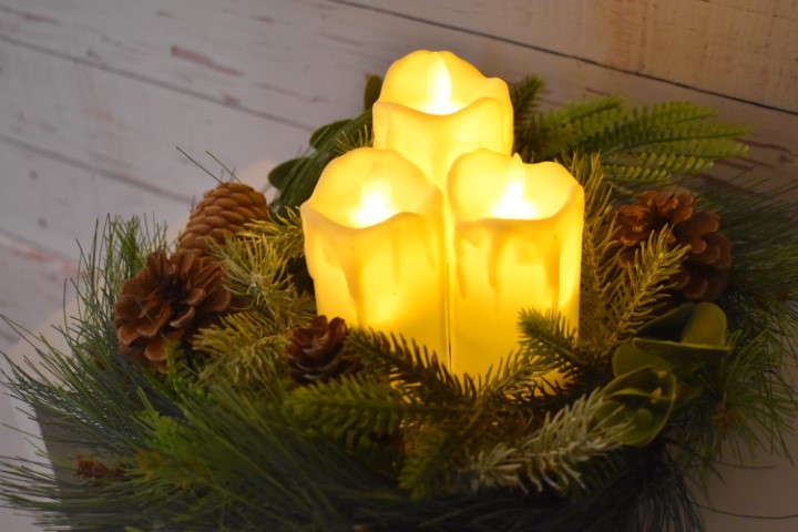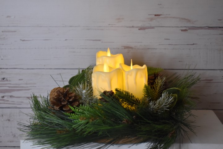 Επιτραπέζιο στεφάνι από κλαδιά πεύκου και κουκουνάρια. Συνοδεύεται με τρία κεράκια. Διάμετρος 33εκ.