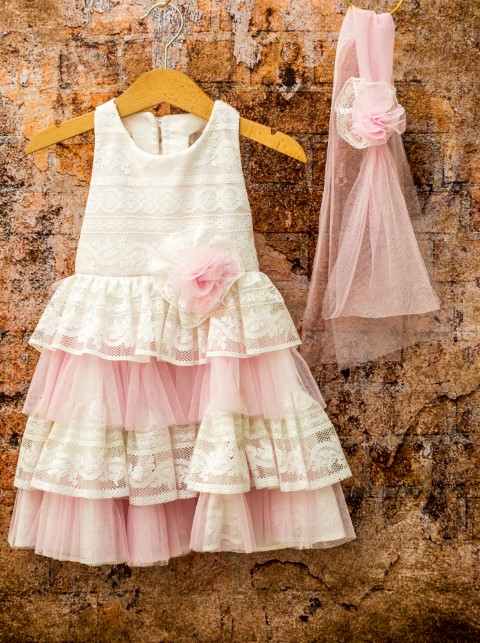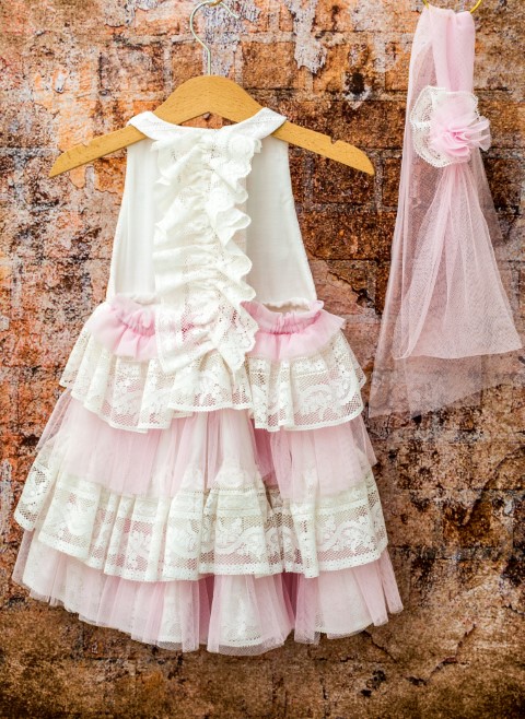 Φόρεμα με παρτούς ώμους από βαμβακερή δαντέλα, τούλι και ταφτά. Πλούσια φούστα με βολάν και εντυπωσιακή πλάτη με δαντέλα. Συνοδεύεται με κορδέλα για τα μαλλιά.