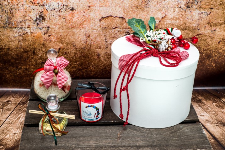 Χριστουγεννιάτικο σετ δώρου διακοσμημένο με καρό κόκκινη κορδέλα, πικ έλατου, ταμπέλα merry christmas, candy cane και κουκουνάρι. Το κουτί περιέχει: άλατα μπάνιου 250γρ, αρωματικό κερί και αρωματικό χώρου 40γρ. Διαστάσεις κουτιού: Φ20x15εκ.