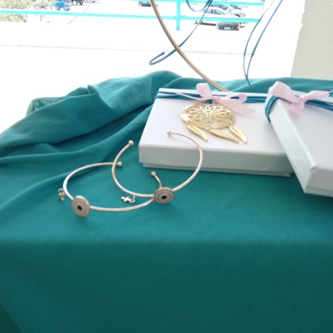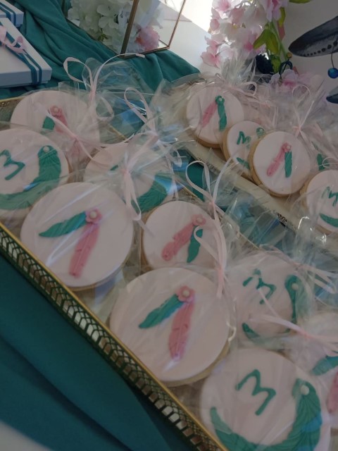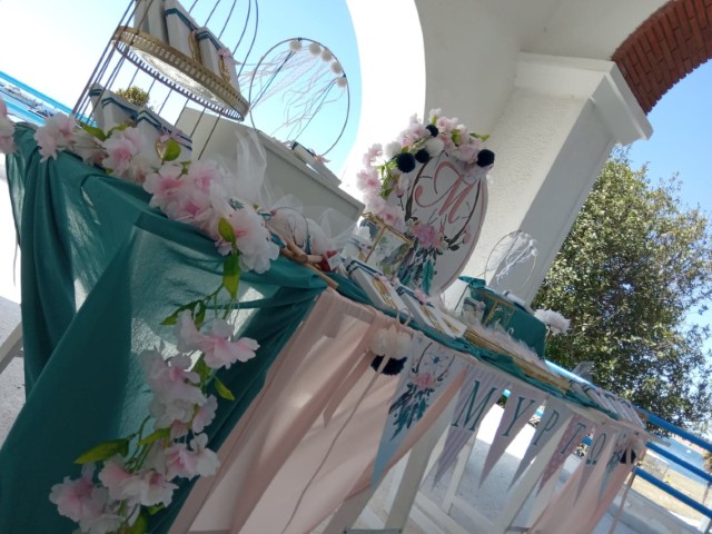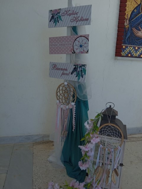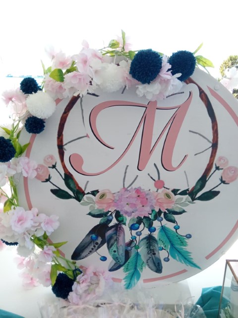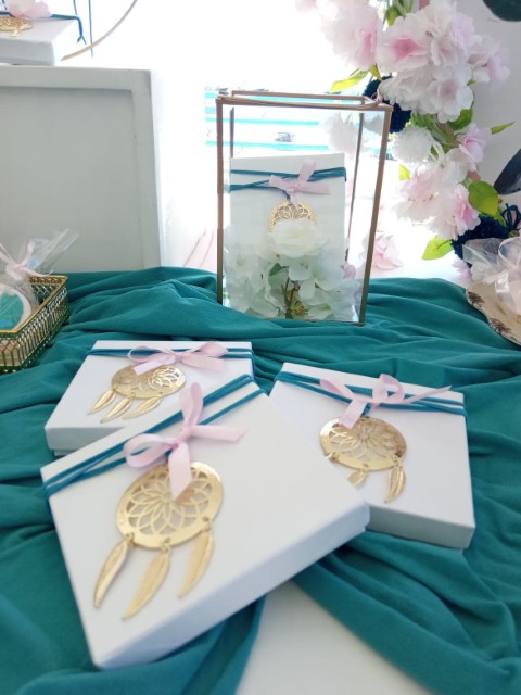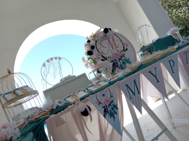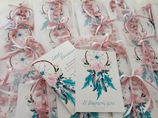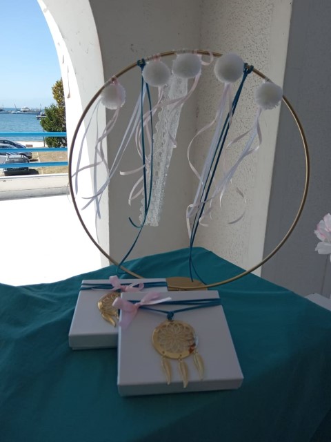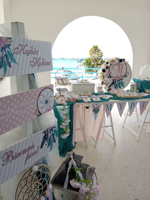 Όμορφες ιδέες διακόσμησης που κέρδισαν την προσοχή των καλεσμένων, από την βάπτιση της μικρής Μυρτούς. Σε αποχρώσεις του πετρόλ και του ροζ, συνδυασμένες με χρυσές λεπτομέρειες , πομ πομ, φτερα και χειροποίητες ονειροπαγίδες.