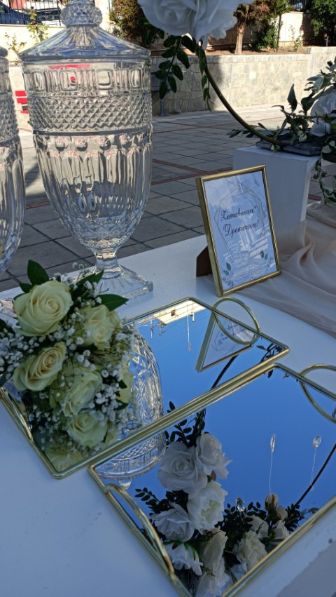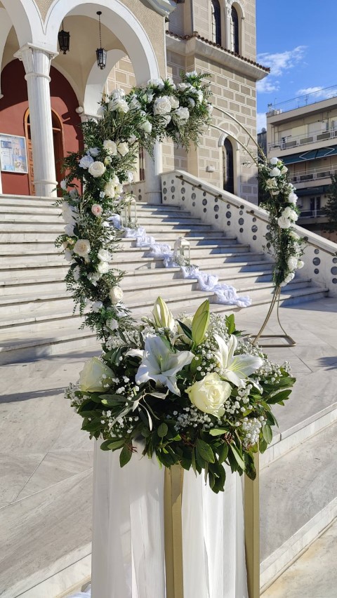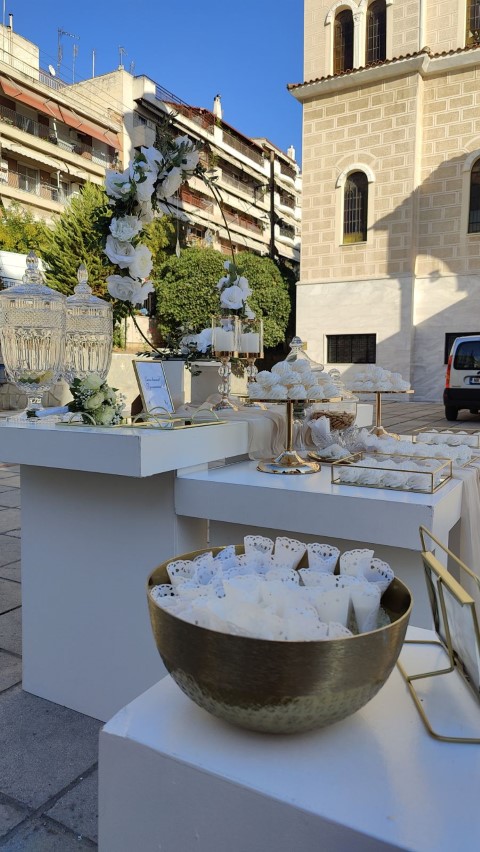 Υπέροχος καλοκαιρινός γάμος σε αποχρώσεις του λευκού με χρυσές λεπτομέρειες. Εντυπωσιακός ο στολισμός της σκάλας, με κεντρικό στοιχείο, την στρόγγυλη μεταλλική αψίδα διακοσμημένη με λευκά τριαντάφυλλα. Ένας γάμος γεμάτος όμορφες λεπτομέρειες και παραμυθένια λάμψη.
