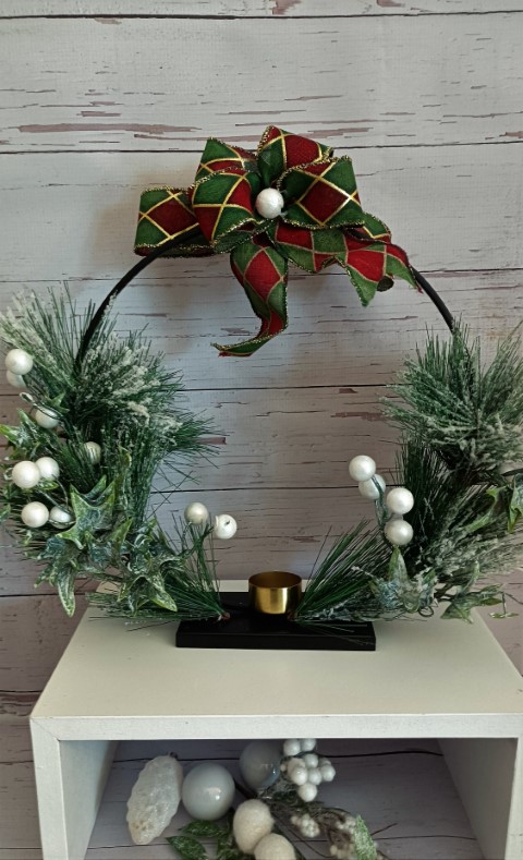 Μεταλλικό επιτραπέζιο στεφάνι διακοσμημένο με κλαδιά ελάτου και χριστουγεννιάτικη κορδέλα. Διάμετρος: 30εκ.