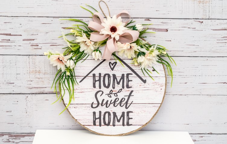 Ταμπέλα sweet home με μαργαρίτες και ροζ αντικέ φιόγκο