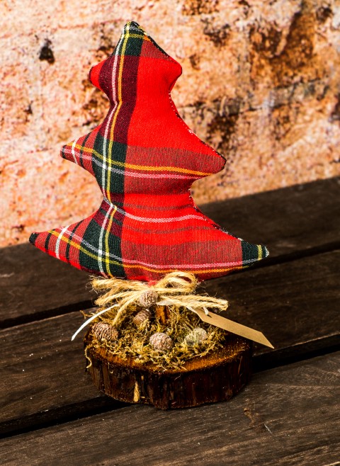 Χριστουγεννιάτικο υφασμάτινο κόκκινο δεντράκι επάνω σε κορμό. Κατασκευασμένο από φυσικά υλικά. Διαστάσεις: ύψος 20 x φάρδος 13 εκ. Βάση διαμ. 9εκ.
