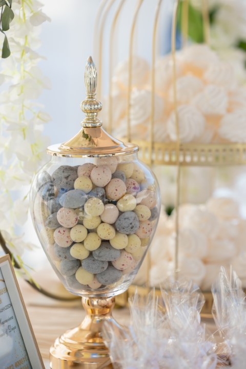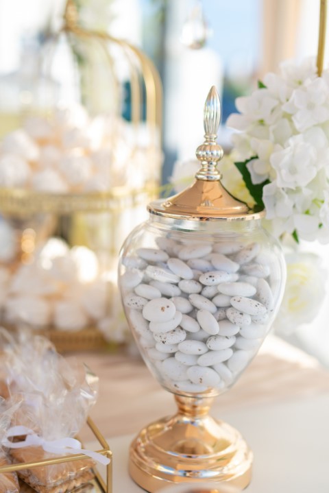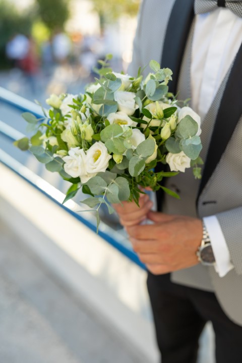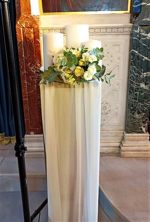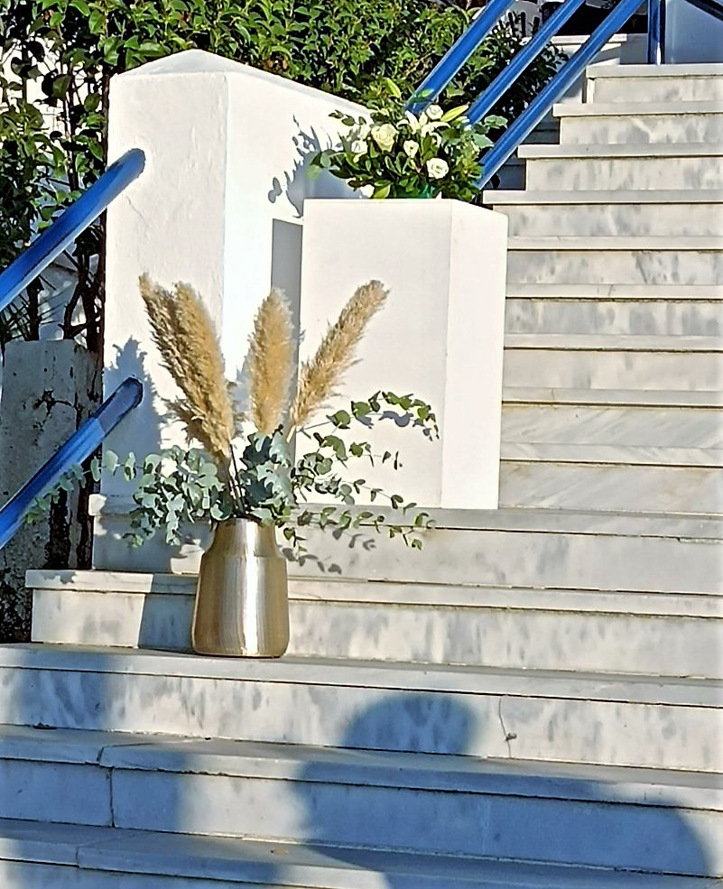 Υπέροχα λευκά τριαντάφυλλα μαζί με  ευκάλυπτο και πλούσια pampas επίλεξαν ο Αχιλλέας και η Αργυρώ για τον γάμο τους. Λιτός αλλά ταυτόχρονα εντυπωσιακός ο στολισμός της σκάλας, με χρυσά βάζα, κηροπήγια και συνθέσεις λουλουδιών επάνω σε κύβους. Ένας κομψός γάμος με chic λεπτομέρειες σ' ένα λαμπερό αποτέλεσμα!