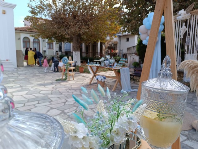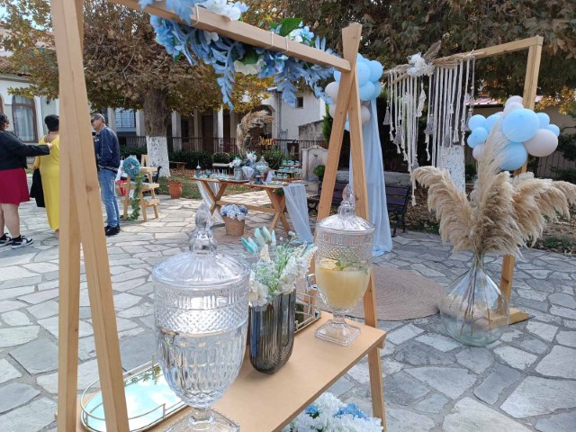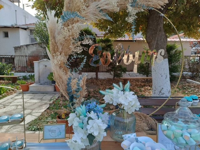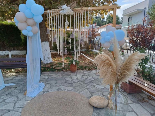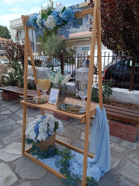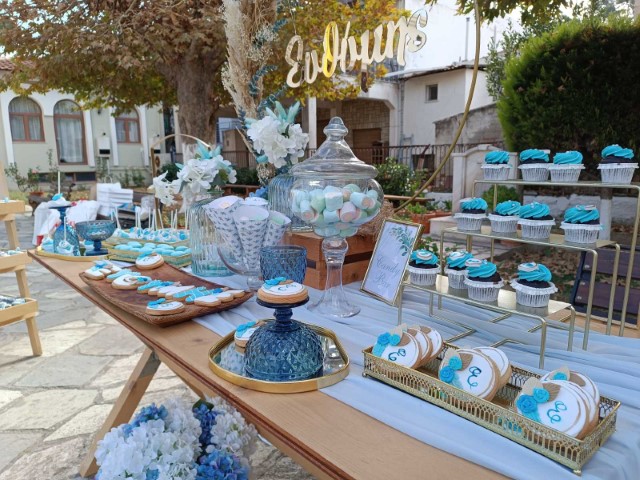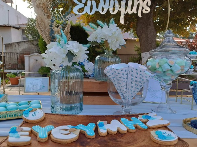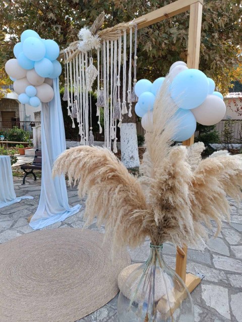 Elegant bohemian στολισμό για την βάπτιση του Ευθύμη. Κυρίαρχο χρώμα το γαλάζιο με χρυσές λεπτομέρειες στα διακοσμητικά και υπέροχα βάζα με pampas και ορτανσίες. Εντυπωσιακό dessert table με κεντρικό στοιχείο μεταλλικό κύκλο και στο κέντρο το όνομα του μωρού. Ποικιλία γλυκών με εντυπωσιακό συνδυασμό γεύσεων και χρωμάτων. Απολαύστε το φωτογραφικό υλικό και ελάτε να δημιουργήσουμε έναν μοναδικό στολισμό για την βάπτιση του παιδιού σας!