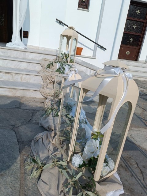 Διακόσμηση γάμου με ελιά και λευκά τριαντάφυλλα. Εντυπωσιακή αψίδα στην είσοδο της εκκλησίας και διάδρομο με φανάρια, κλαδιά ελιάς και υφάσματα. Πρωτότυπα κυματιστά τραπέζια υποδοχής, πεντανόστιμα εδέσματα, βεντάλιες για δροσούλα και μοναδικές λεπτομέρειες διακόσμησης. Είναι μία από τις αγαπημένες επιλογές στολισμού γιατί εκπέμπει κομψότητα και ελληνικό ύφος.