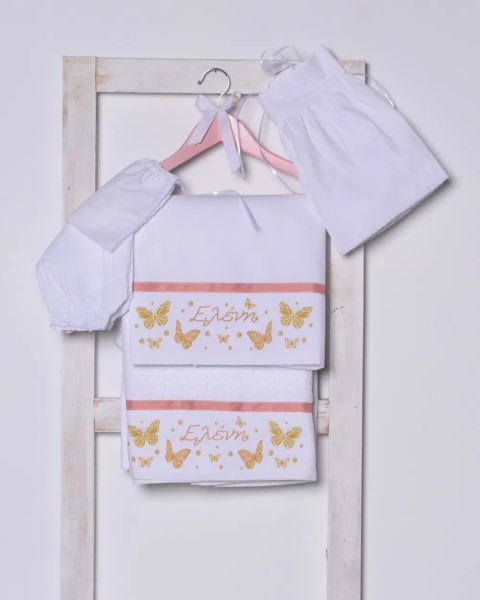 Σετ λαδόπανα βάπτισης για κορίτσι με θέμα πεταλούδες. Το σετ περιλαμβάνει πετσέτα, σεντόνι, εσώρουχα και καπελάκι. Δυνατότητα εκτύπωσης του δικού σας θέματος.