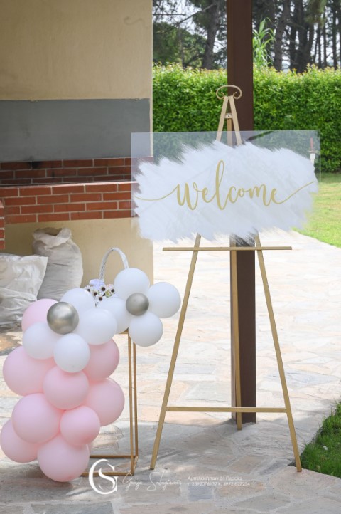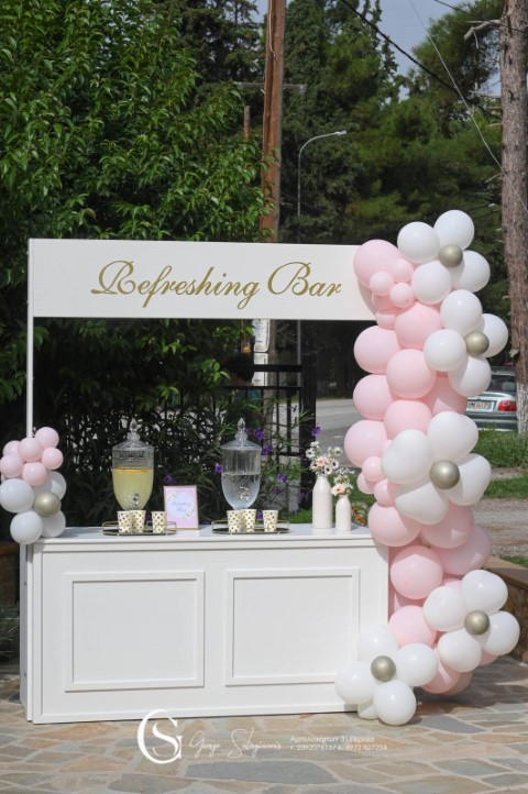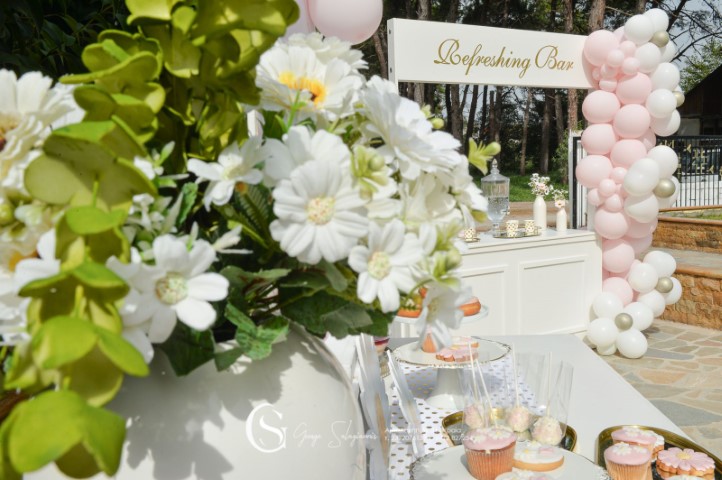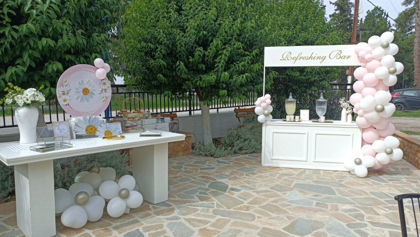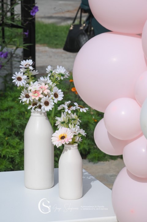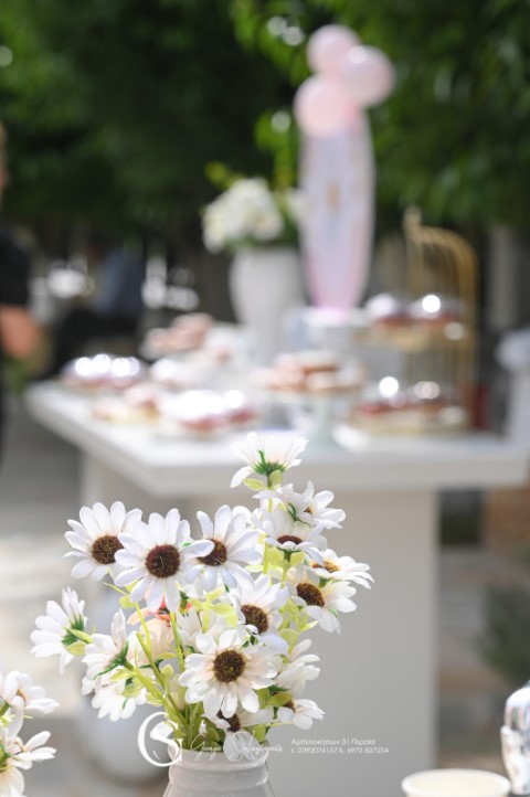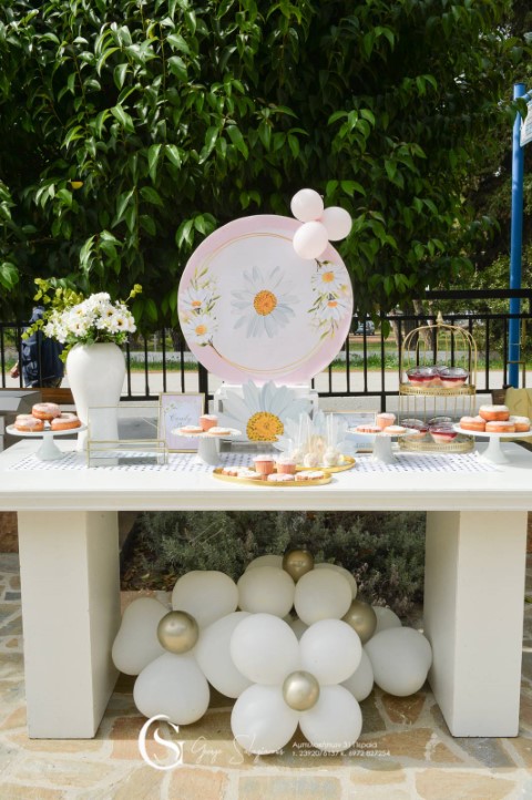 Κομψος με chic λεπτομέρειες στολισμός σ' ένα μοναδικό λαμπερό αποτέλεσμα. Κυρίαρχο στοιχείο οι μαργαρίτες που συμβολίζουν αγνότητα, αθωότητητα και νέα ξεκινήματα. Σύμφωνα λοιπόν με τον συμβολισμό τους κυριάρχησε το λευκό χρώμα, αέρινα υφάσματα, όμορφες συνθέσεις μπαλονιών και ιδιαίτερες λεπτομέρειες διακόσμησης. Απολαύστε το φωτογραφικό υλικό και ελάτε να δημιουργήσουμε ένα μοναδικό στολισμό για την βάπτιση του παιδιού σας!
