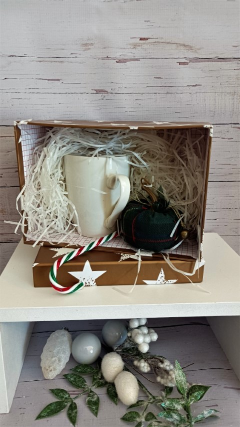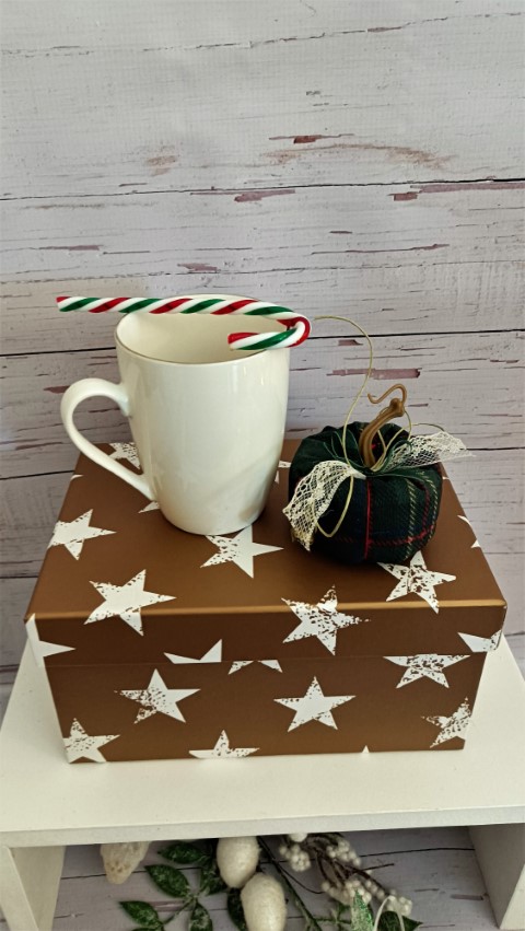 Κούπα και διακοσμητική κολοκύθα σε όμορφο Χριστουγεννιάτικο κουτί με αστεράκια. Διαστάσεις κουτιού: 21,5 x 14.4 x 11εκ. ύψος.