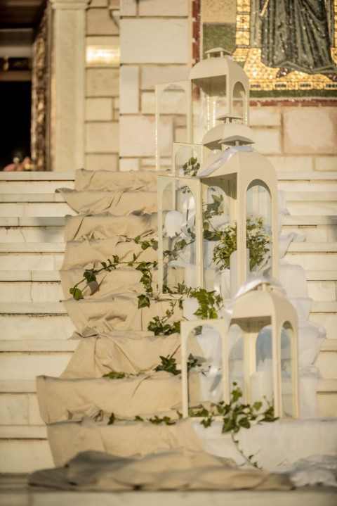 Μία άκρως ρομαντική και κομψή διακόσμηση για τον Ανδρέα και την Έλενα. Εντυπωσιακός ο στολισμός στις σκάλες της εκκλησίας, με φανάρια, συνθέσεις λουλουδιών σε απαλές ροζ και ιβουάρ αποχρώσεις, κισσούς και χρυσές λεπτομέρειες.  Η εντυπωσιακή άφιξη της νύφης στην εκκλησία με το αυτοκίνητο αντίκα, έκλεψε τις εντυπώσεις! Ένας όμορφος γάμος με παραμυθένιο σκηνικό και διαχρονική αξία.