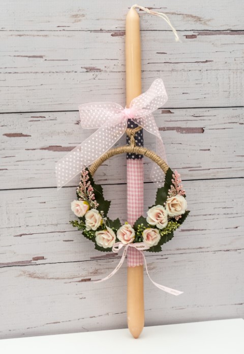 Πασχαλινή λαμπάδα με στεφανάκι διακοσμημένο με λουλούδια.