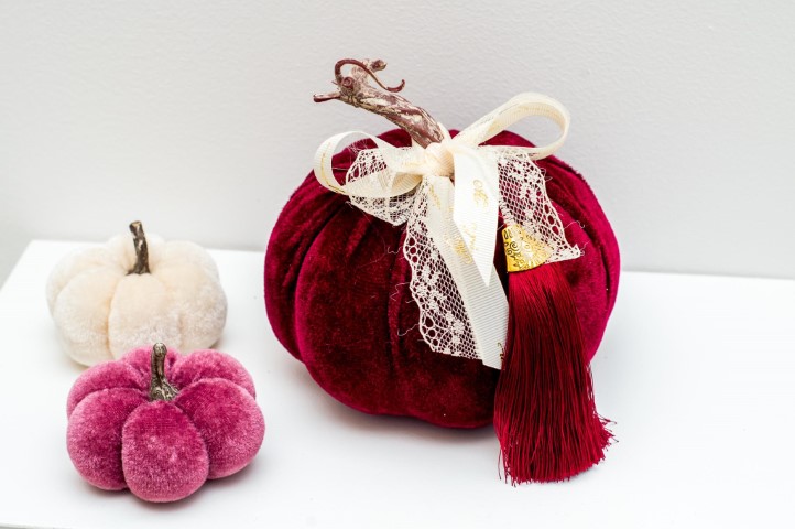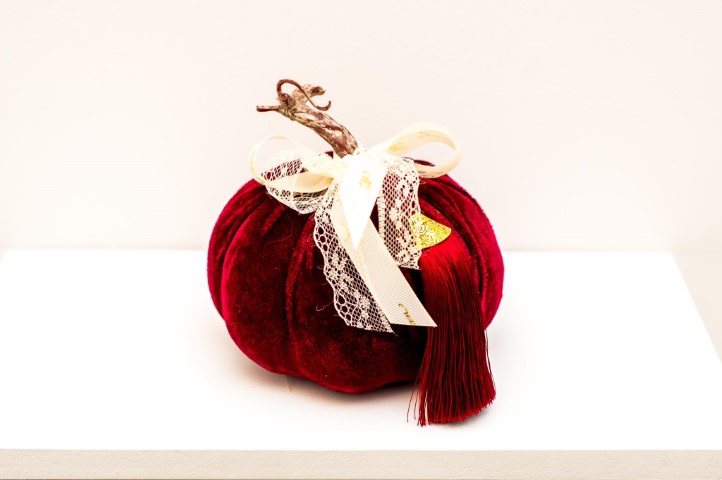Κολοκύθα γούρι σε μπορντό βελούδο ύφασμα. Διάσταση 12εκ.