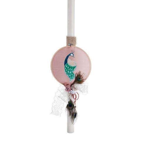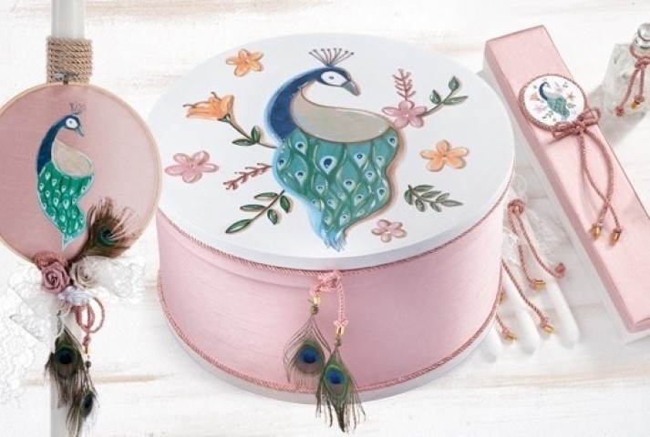 Βαπτιστικό σετ που περιλαμβάνει ξύλινη natural καπελιέρα ζωγραφισμένη στο χέρι με θέμα το παγώνι σε βεραμάν μπλε απόχρωση. Το κάτω μέρος της καπελιέρας είναι ντυμένο με μεταξωτό σαντούκ ύφασμα και διακοσμημένο με rayon κορδόνι. Διαστάσεις: 48x25εκ. Λαμπάδα διακοσμημένη με τελάρο από ξύλο και ύφασμα με την ίδια θεματική παράσταση , ύψος 90εκ. Λαδοσέτ σε παραλληλόγραμμο κουτί ντυμένο με ύφασμα σαντούκ και περιλαμβάνει 3 κεράκια, μπουκαλάκι για το λάδι και σαπουνάκι μέσα σε πουγκί, όλα στολισμένα σε λευκές - σάπιο μήλο αποχρώσεις. Διαστάσεις 47x9εκ. Ελάχιστος χρόνος παράδοσης 15 εργάσιμες ημέρες.