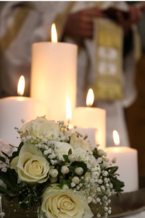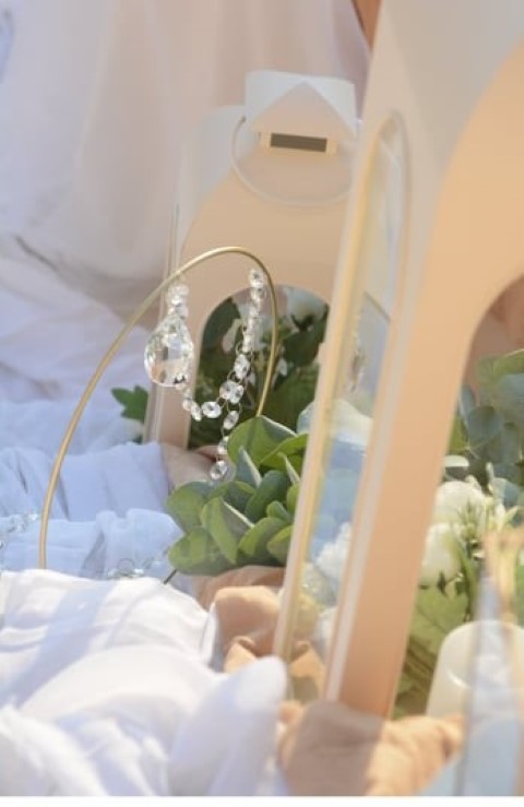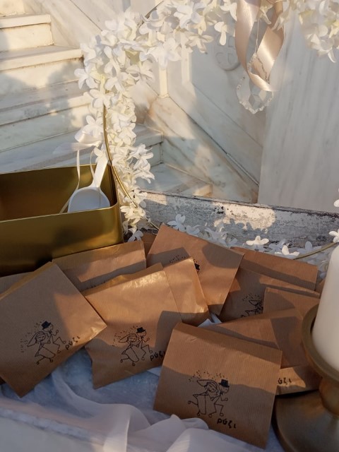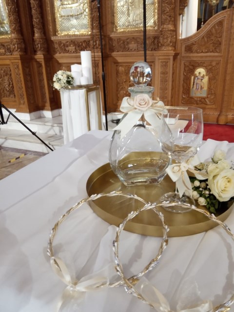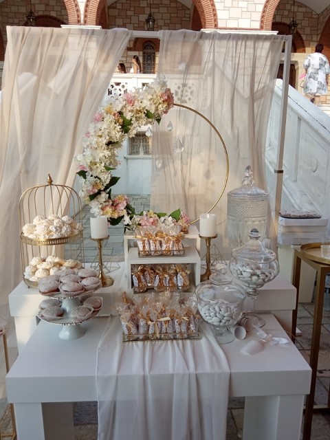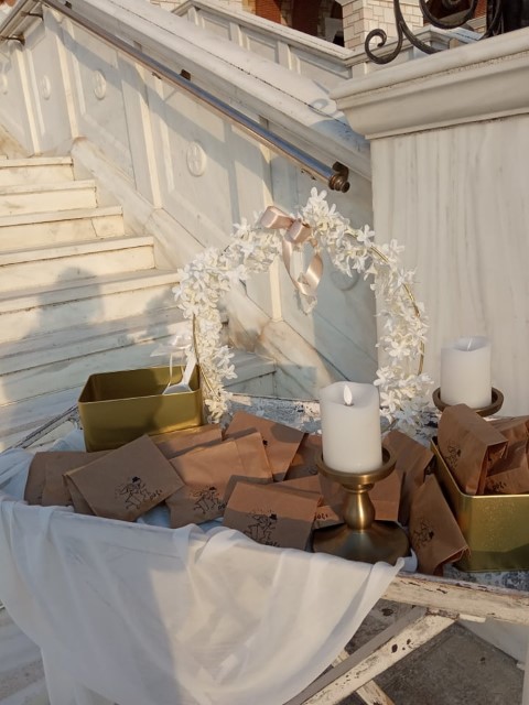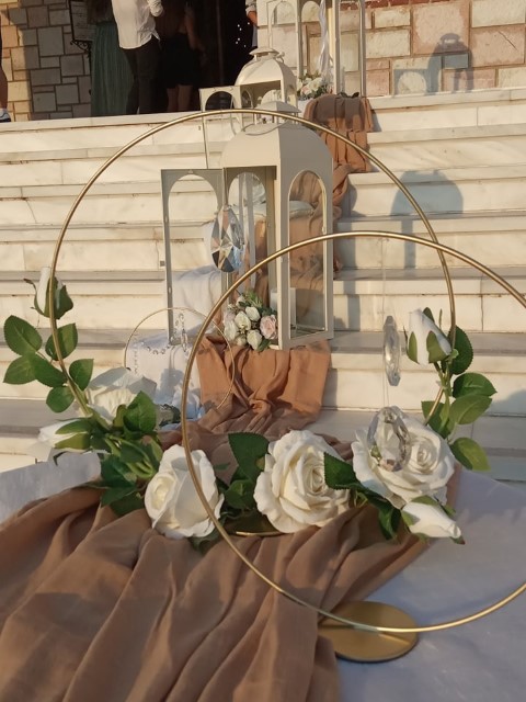 Εντυπωσιακός στολισμός στις σκάλες της εκκλησίας, με φανάρια, υφάσματα σε γήινες αποχρώσεις, δύο ροτόντες στο πλατύσκαλο, χρυσά κηροπήγια, μεταλλικοί διακοσμητικοί κύκλοι και μπουκέτα λουλουδιών. Τραπέζι υποδοχής με κεντρικό στοιχείο μία μεγάλη χρυσή μεταλλική βάση, διακοσμημένη με λουλούδια και κρύσταλλα. Ύπεροχο κλασικό αποτέλεσμα με μοντέρνες πινελιές.