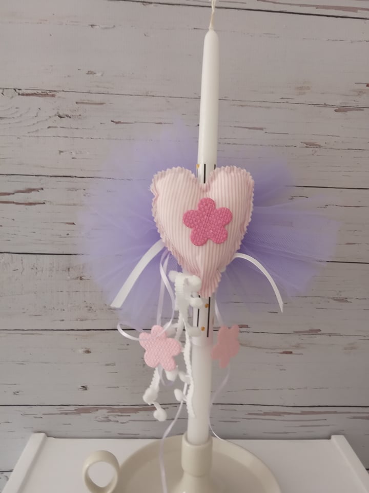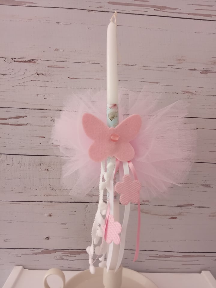 Πασχαλινή λαμπάδα για κορίτσι με πομ πομ και πεταλούδα σε ροζ χρώμα.