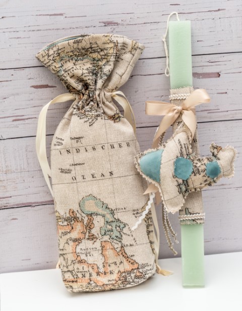 Πασχαλινή λαμπάδα για αγόρι με υφασμάτινο αεροπλανάκι και ασορτί πουγκί που μπαίνει μέσα η λαμπάδα.Για τυχόν αλλαγές επικοινωνήστε με το κατάστημά μας.