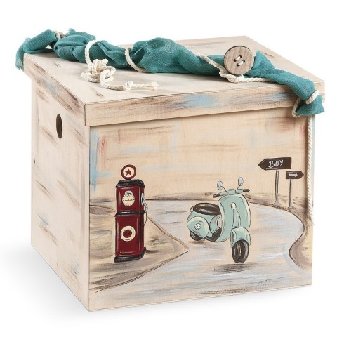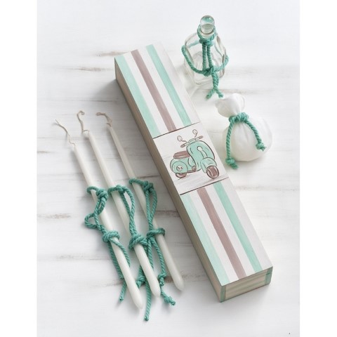 Βαπτιστικό σετ για αγόρι που περιλαμβάνει ξύλινο natural κουτί ζωγραφισμένο στο χέρι με θέμα βέσπα (37x37x37εκ.) Λαμπάδα ξύλινος κηροστάτης - κρεμάστρα διακοσμημένος με ξύλινο καδράκι και στολισμένος με λευκή γάζα (ύψος 93εκ.) Λαδοσέτ σε ξύλινο natural κουτί που περιλαμβάνει τρία κεράκια, σαπουνάκι σε πουγκί και μπουκαλάκι για λάδι, όλα στολισμένα σε μπεζ - λευκές - βεραμάν αποχρώσεις (49X9εκ.)