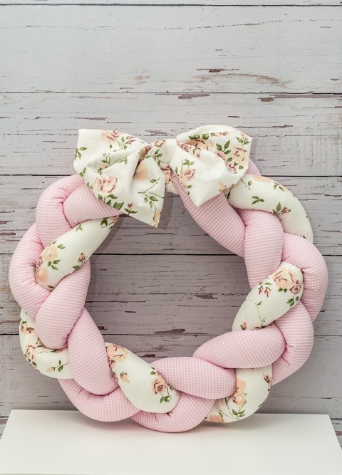 Χειροποίητο στεφάνι πλεξούδα από ύφασμα σε καρό και εμπριμέ μοτίβο.