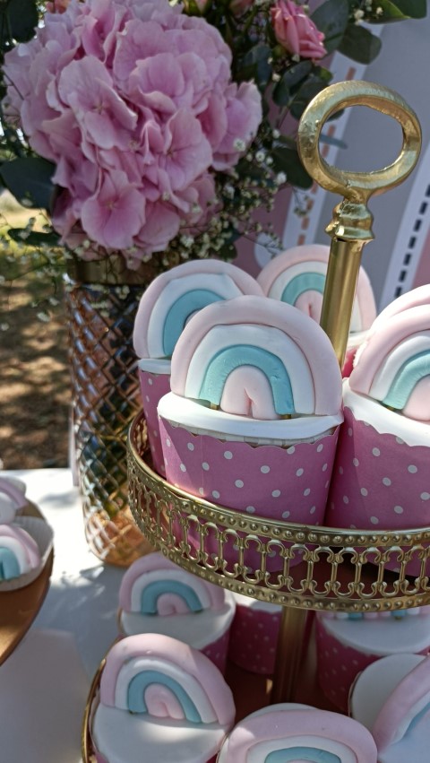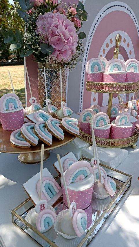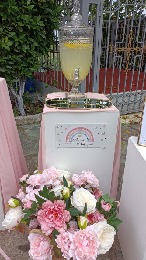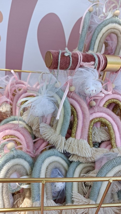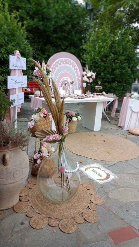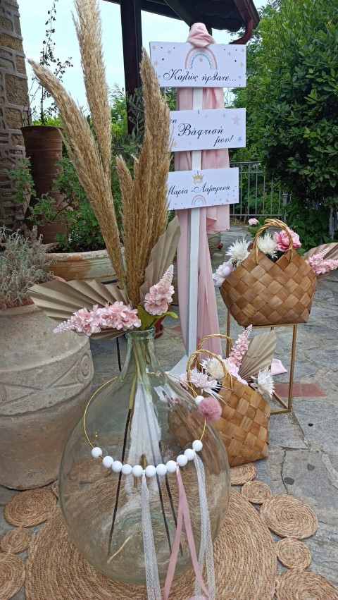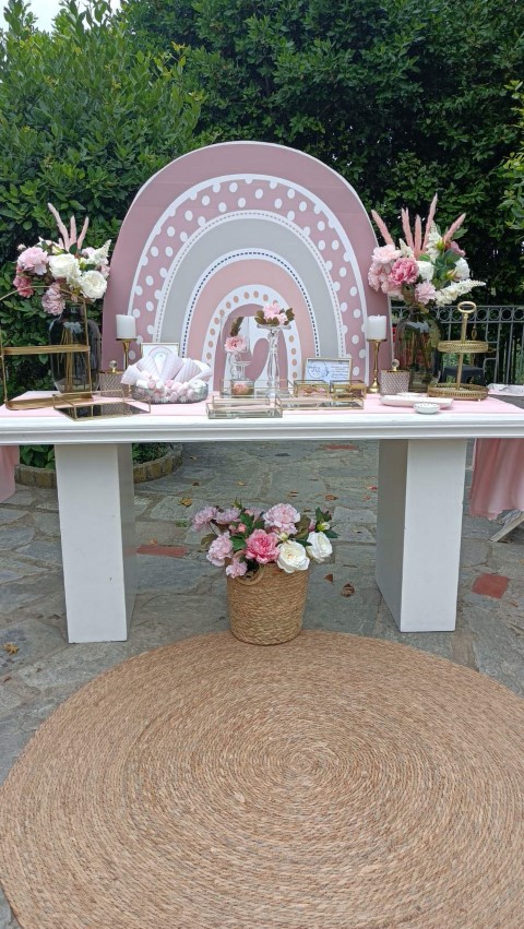 Χαρούμενος στολισμός με θέμα ουράνιο τόξο. Μία μεγάλη κατασκευή, στο κέντρο του τραπεζιού, σε αποχρώσεις του ροζ πλαισιωμένο με δύο βαζα γεμάτα χρωματιστά λουλούδια. Ορντεβιέρες και δισκάκια καθρέφτες με περίτεχνα γλυκά, μπομπονιέρες μακραμέ και κουμπαράδες για τους μικρούς καλεσμένους, όλα συνδυασμένα αρμονικά με το θέμα. Εντυπωσιακό welcome stand διακοσμημένο με λουλούδια μεσα σε καλάθια και ένα μεγάλο επιδαπέδιο βάζο με pampas. Απολαύστε το φωτογραφικό υλικό και ελάτε να δημιουργήσουμε ένα μοναδικό στολισμό για την βάπτιση του παιδιού σας.