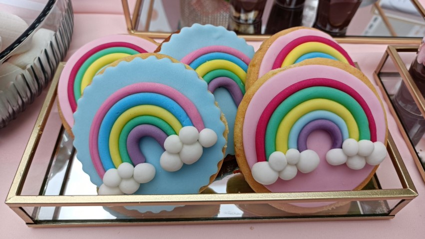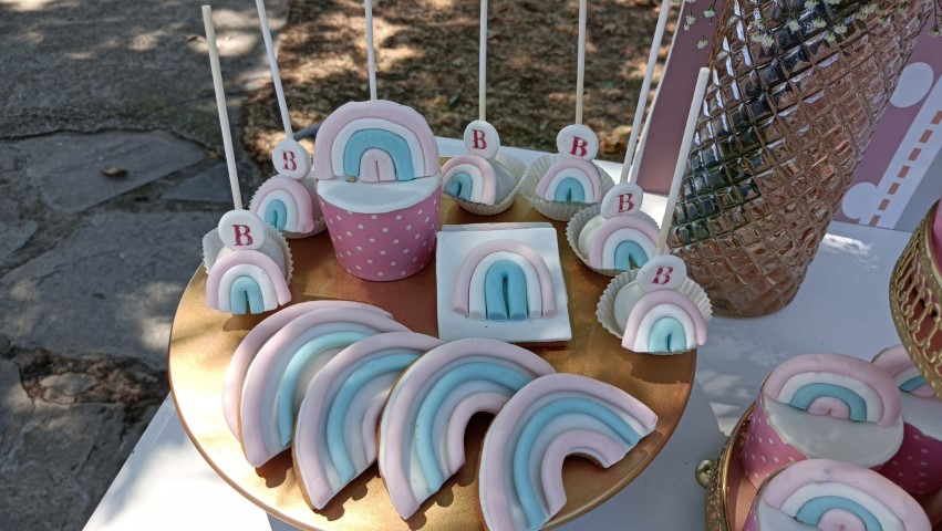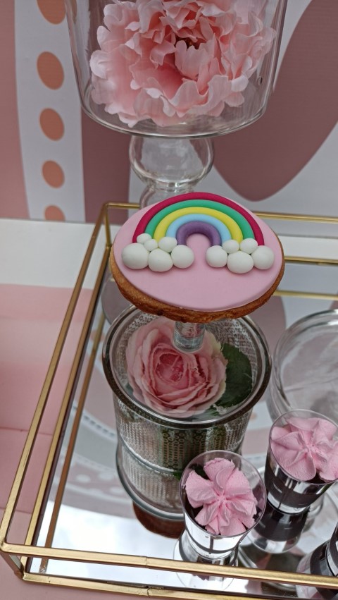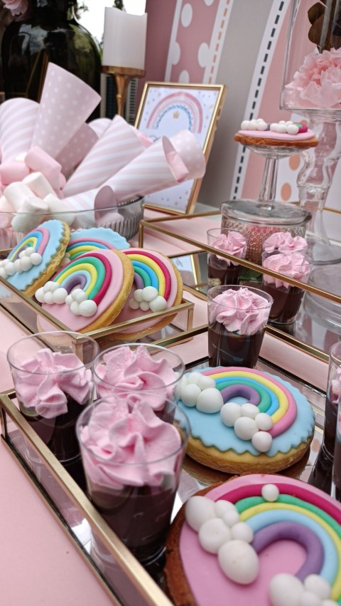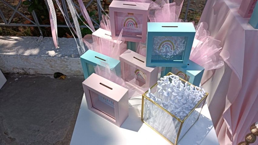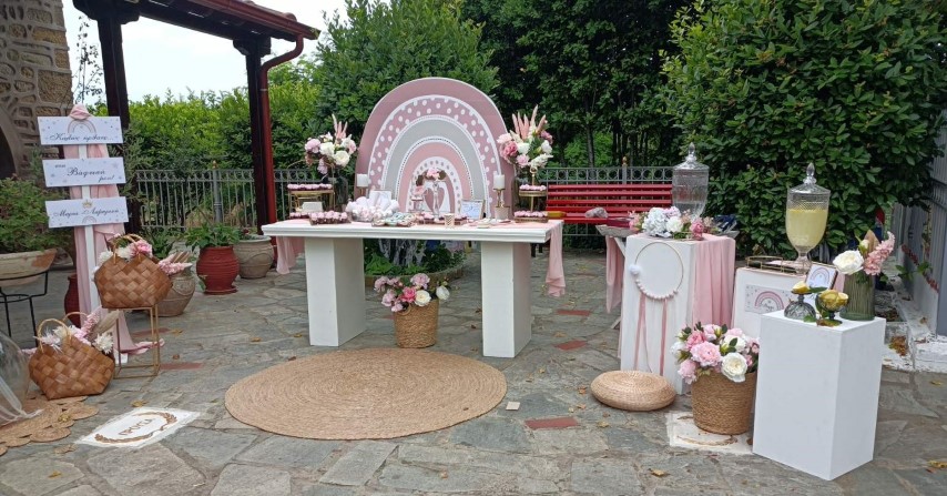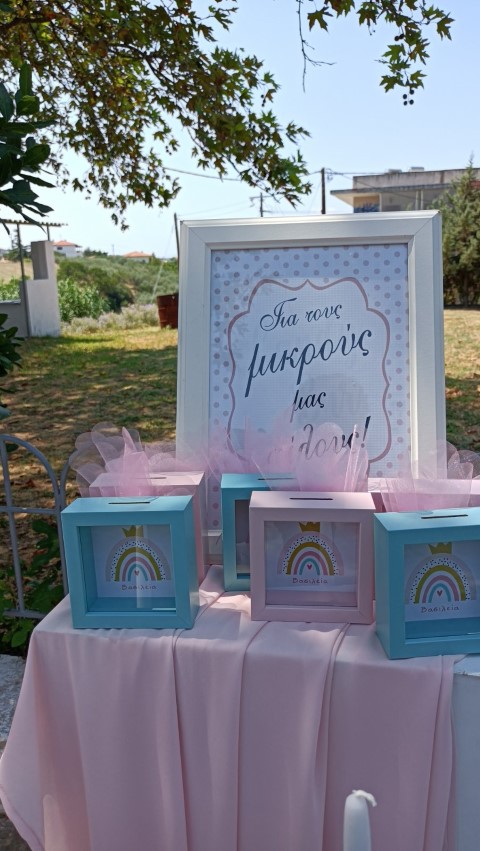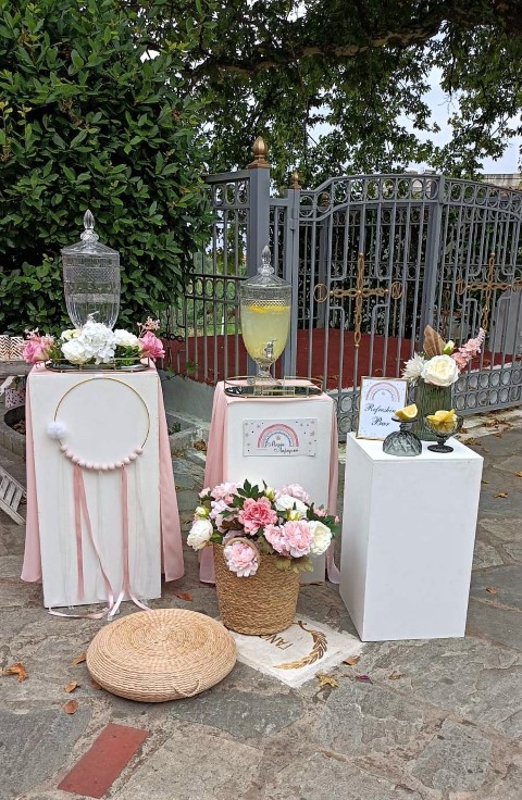 Χαρούμενος στολισμός με θέμα ουράνιο τόξο. Μία μεγάλη κατασκευή, στο κέντρο του τραπεζιού, σε αποχρώσεις του ροζ πλαισιωμένο με δύο βαζα γεμάτα χρωματιστά λουλούδια. Ορντεβιέρες και δισκάκια καθρέφτες με περίτεχνα γλυκά, μπομπονιέρες μακραμέ και κουμπαράδες για τους μικρούς καλεσμένους, όλα συνδυασμένα αρμονικά με το θέμα. Εντυπωσιακό welcome stand διακοσμημένο με λουλούδια μεσα σε καλάθια και ένα μεγάλο επιδαπέδιο βάζο με pampas. Απολαύστε το φωτογραφικό υλικό και ελάτε να δημιουργήσουμε ένα μοναδικό στολισμό για την βάπτιση του παιδιού σας.