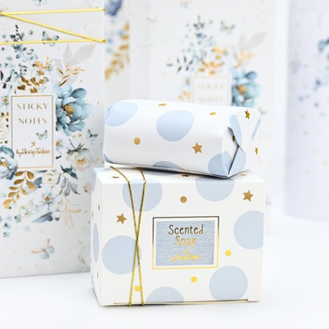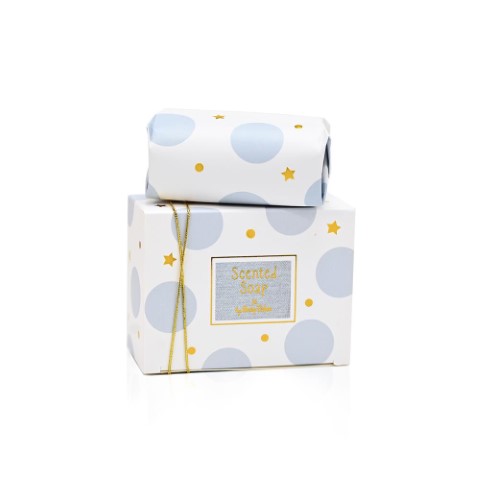 Μπομπονιέρα βάπτισης για αγόρι σαπουνάκι miracle blue 100γρ. σε πολυτελή συσκευασία με χρυσές λεπτομέρειες και άρωμα white jasmine. Δεμένη με πέντε κουφέτα Χατζηγιαννάκη. Ελάχιστη ποσότητα παραγγελίας 40τμχ.