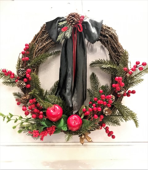 Χριστουγεννιάτικο στεφάνι λυγαριάς διακοσμημένο με κλαδιά ελάτου, μήλα , κουκουνάρια, berries και φίογκο από βελούδο ύφασμα.