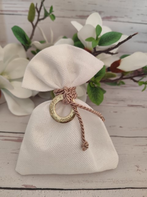 Μπομπονιέρα πουγκί διακοσμημένη με μεταλλικό κρίκο ευχών. Η μπομπονιέρα περιλαμβάνει πέντε κουφέτα.