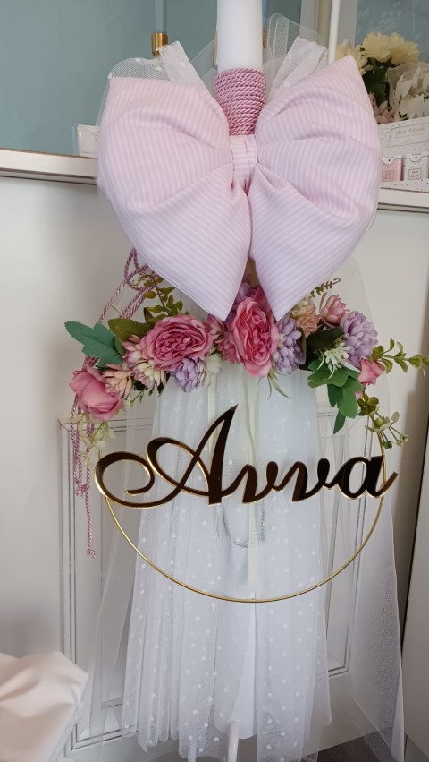 Χειροποίητη λαμπάδα βάπτισης για κορίτσι, διακοσμημένη με στεφάνι, λουλούδια και κοπτικό όνομα από plexiglass. Συνδυάζεται με την αντίστοιχη τσάντα ή βαλίτσα, λαδόπανο και λαδοσέτ. Μπορούν να γίνουν αλλαγές στα χρώματα, στα υφάσματα και στο θέμα της πινακίδας, κατόπιν συνεννοήσεως με το κατάστημά μας.