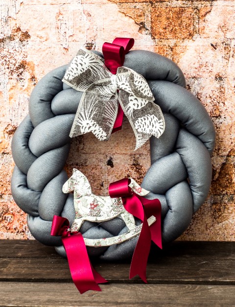 Χριστουγεννιάτκο στεφάνι πλεξούδα σε γκρι χρώμα, διακοσμημένο με ξύλινο αλογάκι και κορδέλες σε μπορντό και ασημί αποχώσεις. Διάμετρος 38 εκ.