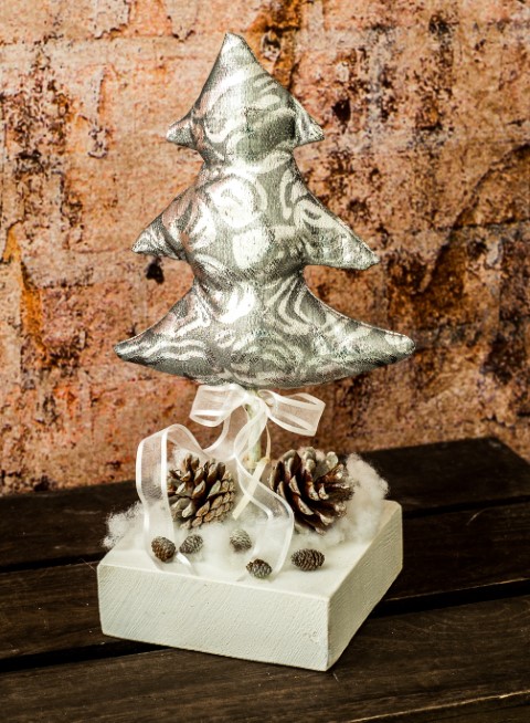 Χριστουγεννιάτικο διακοσμητικό  υφασμάτινο ασημί δεντράκι σε λευκή ξύλινη βάση. Διαστάσεις: ύψος 30 x φάρδος 19 εκ. Βάση 12 x 12εκ.