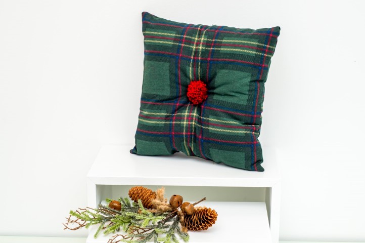 Χριστουγεννιάτικο μαξιλαράκι βαμβακερό σε πράσινο καρό, διακοσμημένο με κόκκινο πον πον. Διαστάσεις 30x30εκ. Η γέμιση περιλαμβάνεται.