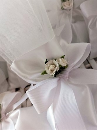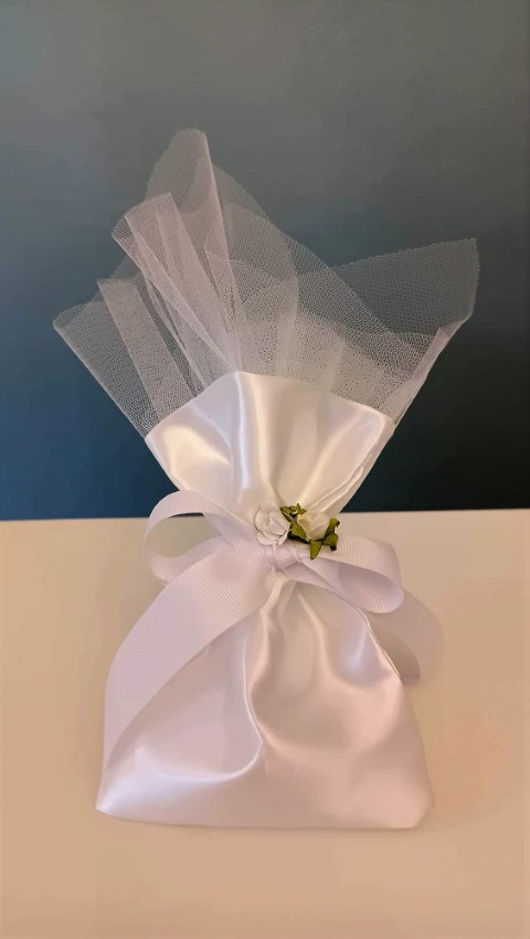 Μπομπονιέρα γάμου σατέν πουγκί με τούλι, δεμένη με γκρο κορδέλα και διακοσμημένη με λουλουδάκια. Περιλαμβάνονται εφτά κουφέτα Χατζηγιαννάκη. Διαστάσεις: πουγκί 17x11εκ. τούλι: 40x40εκ. Μπορούν να γίνουν αλλαγές στο χρώμα κατόπιν συνεννοήσεως με το κατάστημά μας.
