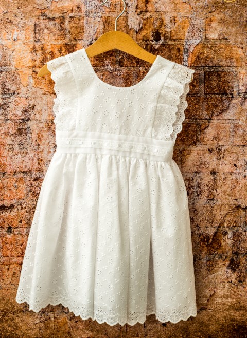 Φόρεμα από λευκή μπροντερί δαντέλα εξαιρετικής ποιότητας, τρέσα αζούρ στη μέση και επενδυμένο με βαμβακερό ύφασμα.