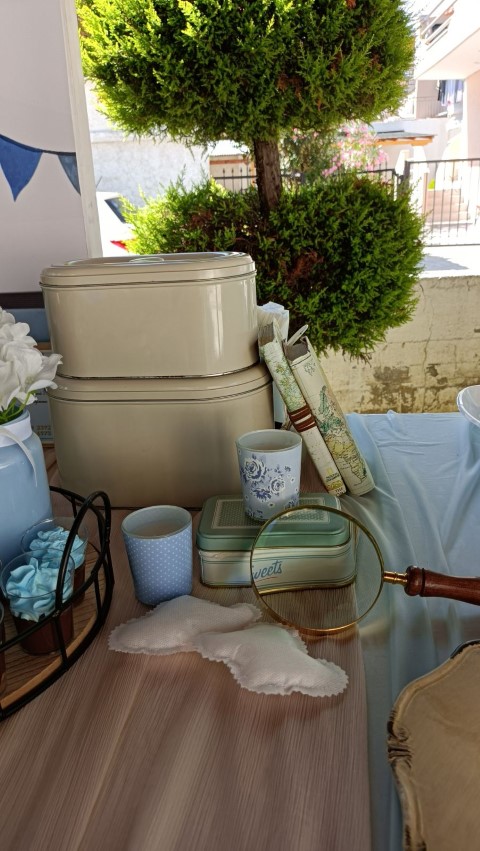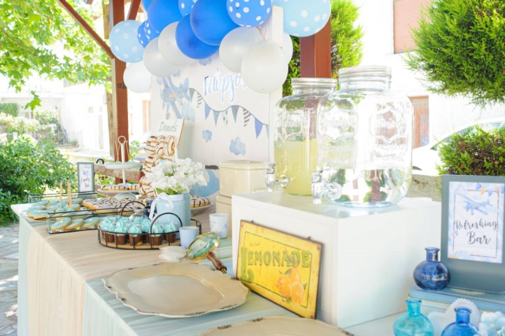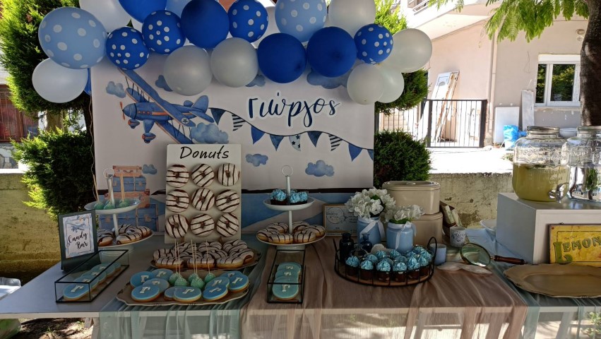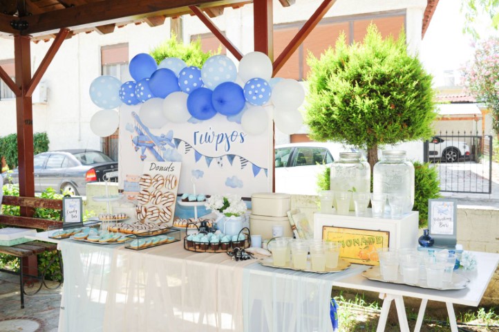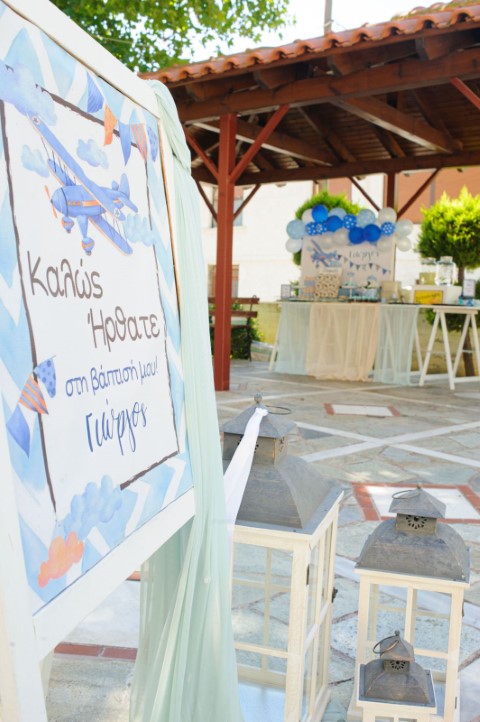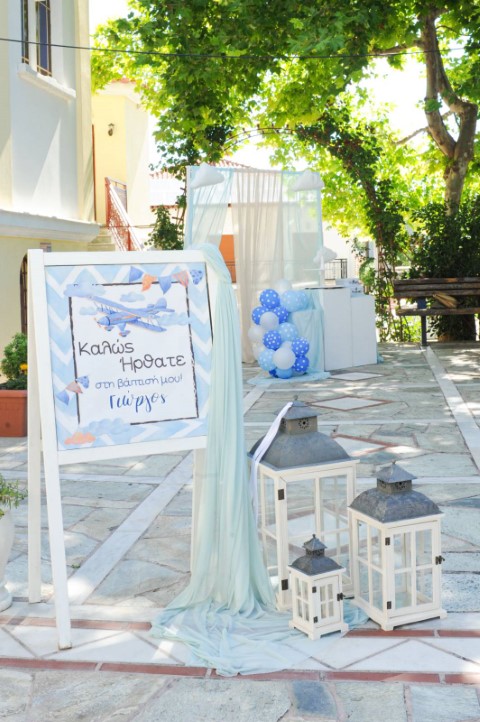 Σ' ολόκληρο τον κόσμο μας ταξιδεύει η βάπτιση του μικρού Γιώργου! Μία όμορφη πρόταση διακόσμησης με θέμα το ταξίδι σε αποχρώσεις του σιέλ και του λευκού με μπλε πινελιές. Όμορφα διακοσμημένα τραπέζια φιλοξένησαν γλυκές λιχουδιές και δροσερή λεμονάδα, ένω οι μπομπονιέρες και τα παιδικά δωράκια εντυπωσίασαν μικρούς και μεγάλους!