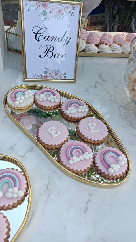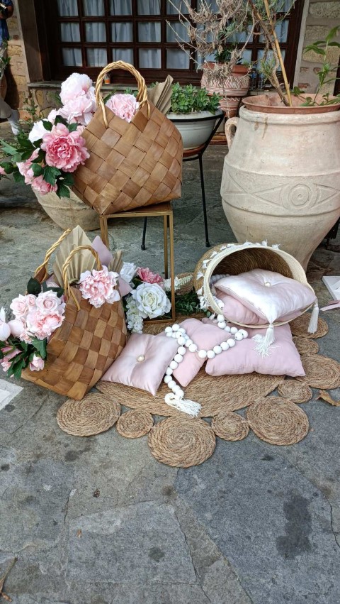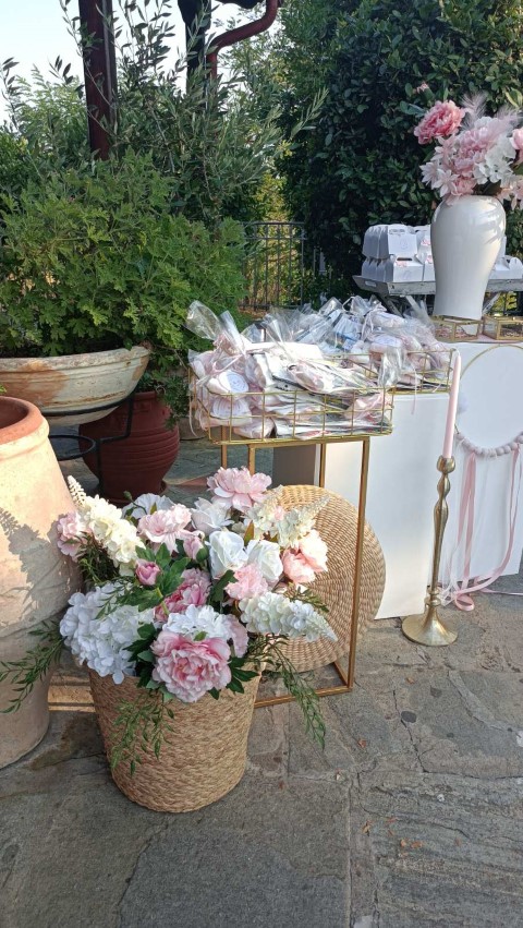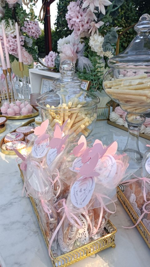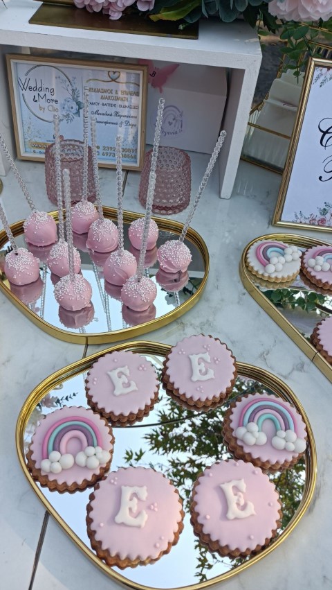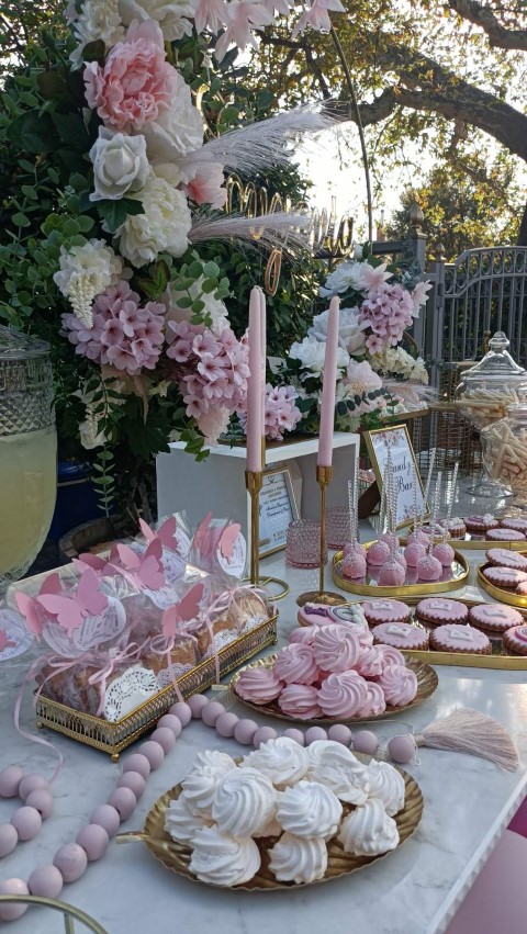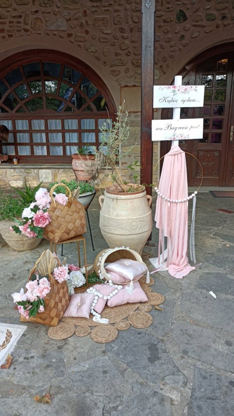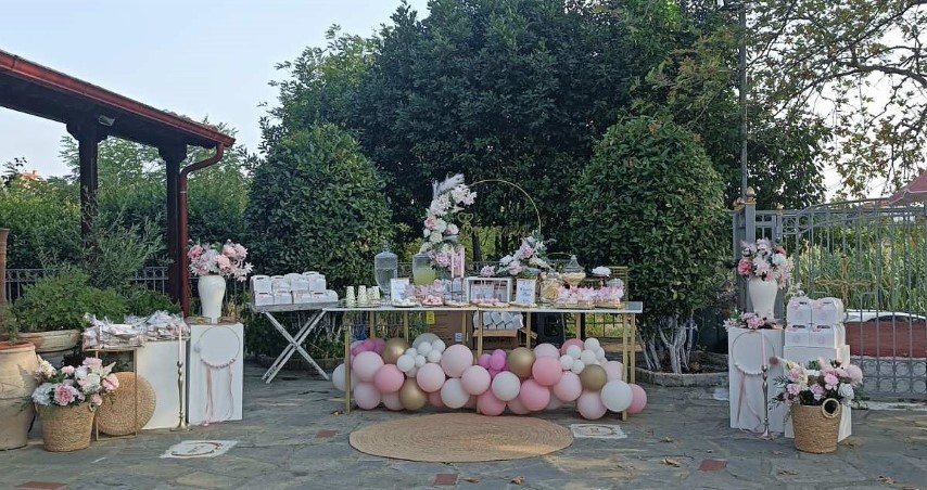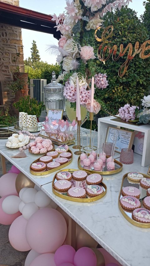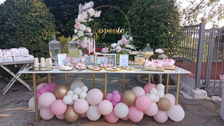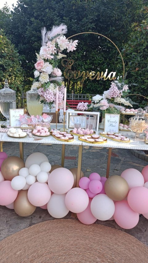 Εντυπωσιακό dessert table με κεντρικό στοιχείο μεταλλική βάση διακοσμημένη με λουλούδια και το όνομα του παιδιού με plexiglass γράμματα. Μία τρέσα μπαλονιών σε ροζ, λευκές και χρυσές αποχρώσεις είναι τοποθετημένη κάτω από το τραπέζι όπου δημιουργεί ένα εντυπωσιακό αποτέλεσμα. Ψάθινα καλάθια με μπουκέτα λουλουδιών, τρέσες με ξύλινες χάντρες, ιδιαίτερα στεφάνια και πολλές άλλες μοναδικές λεπτομέρειες διακόσμησης γεμάτες κομψότητα!