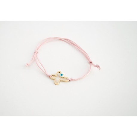 Μαρτυρικό βραχιολάκι βάπτισης για κορίτσι, σε ροζ κερωμένο κορδόνι, με μάτι και χρυσό σταυρουδάκι. Διαθέσιμο σε συσκευασία των 50 τμχ.