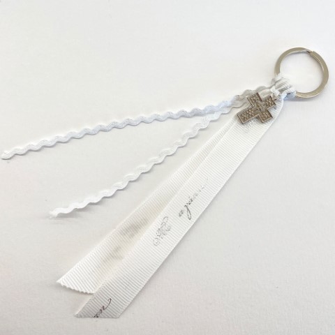 Μαρτυρικό βάπτισης μπρελόκ με σταυρουδάκι. Διατίθεται σε δύο χρώματα, λευκό με ασημί σταυρό και ιβουάρ με χρυσό σταυρό. Συσκευασία των 50 τεμαχίων.