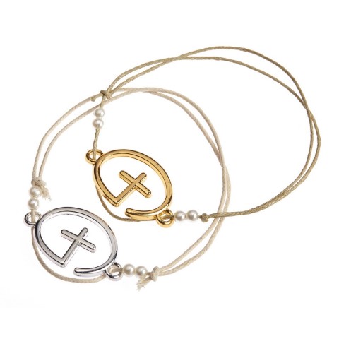Βραχιολάκι μαρτυρικό βάπτισης σταυρουδάκι μέσα σε κύκλο με πέρλες. Διατίθεται σε χρυσό και ασημί. Συσκευασία των 50 τμχ.