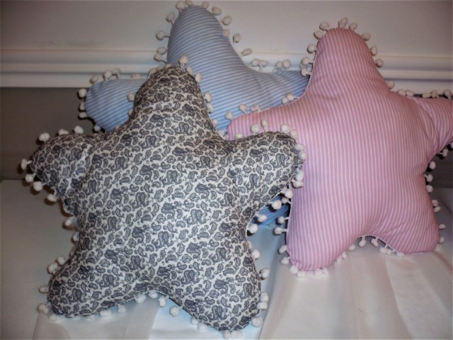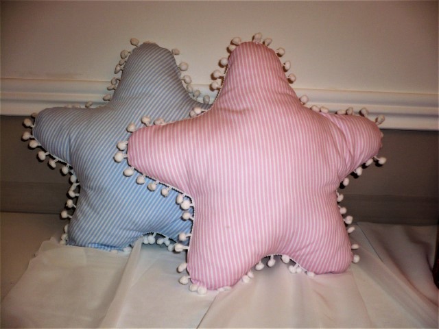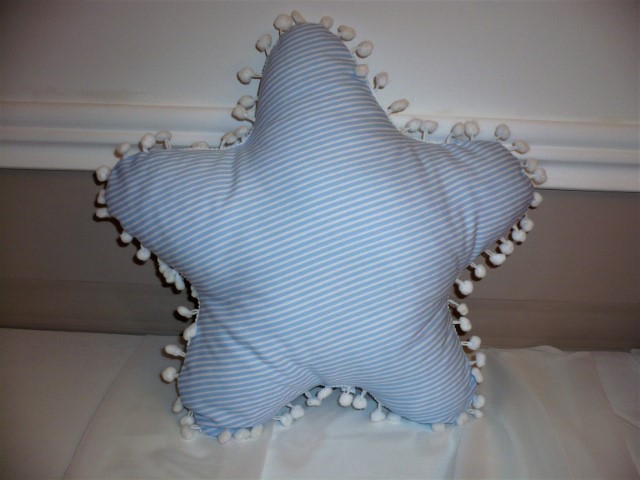 Μαξιλαράκι ριγέ σιέλ αστεράκι σε πικέ βαμβακερό ύφασμα, με πομ πον. Διαστάσεις : Ύψος 38 εκ. Μπορούν να γίνουν αλλαγές στα χρώματα και στα υφάσματα κατόπιν συνεννοήσεως με το κατάστημά μας.