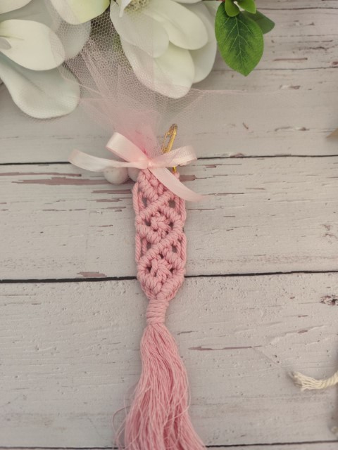 Μπομπονιέρα μπρελόκ μακραμέ, σε δύο χρώματα, δεμένη με πέντε κουφέτα Χατζηγιαννάκη.