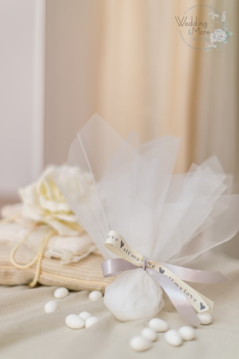 Μπομπονιέρα με διπλό τούλι οργάντζας (διαστάσεων 45x40) δεμένη με κορδέλα που έχει τυπωμένο μήνυμα και επτά κουφέτα Χατζηγιαννάκη.