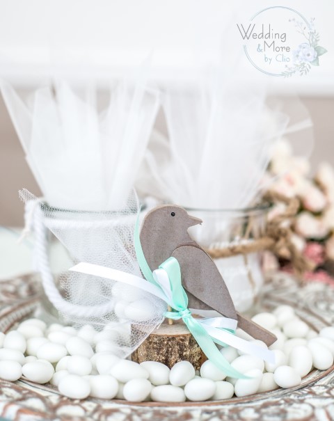 Μπομπονιέρα βάπτισης ξύλινο πουλάκι σε κορμό δεμένη με πέντε κουφέτα Χατζηγιαννάκη. Διαστάσεις:5x6.5εκ. Διάμετρος βάσης:6εκ. Συνολικό ύψος:10εκ.